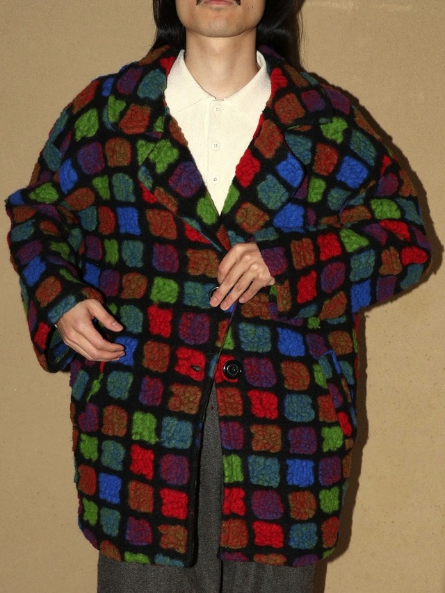モコモコフェルト生地のジャケット ハンドメイド生地なのか、歪みのある不揃いなチェック柄なのがまた味わい深い 緑、赤、青と、それぞれを混ぜ合わせた色ブロックがあります 生地勝ち系ですね おばあちゃんの手作りみたいな、 温もりを感じる1着です 肩幅 64 身幅 64.5 着丈 82 袖丈 51