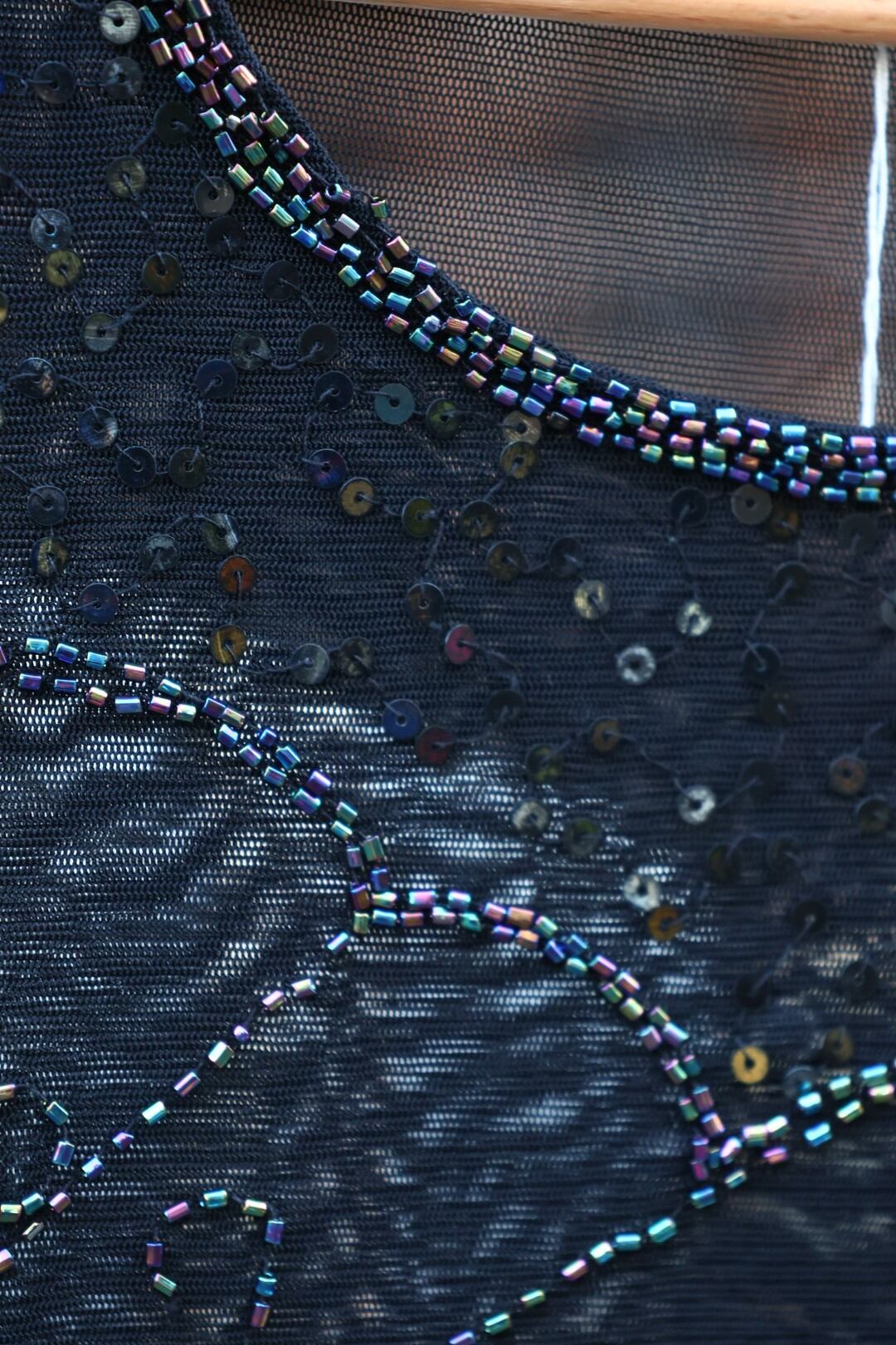 スパンコールとビーズの刺繍で模様がつけられた、シースルートップス