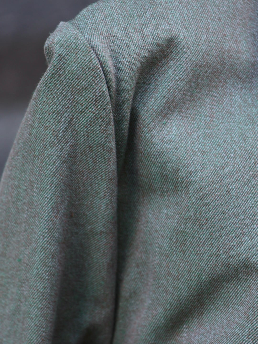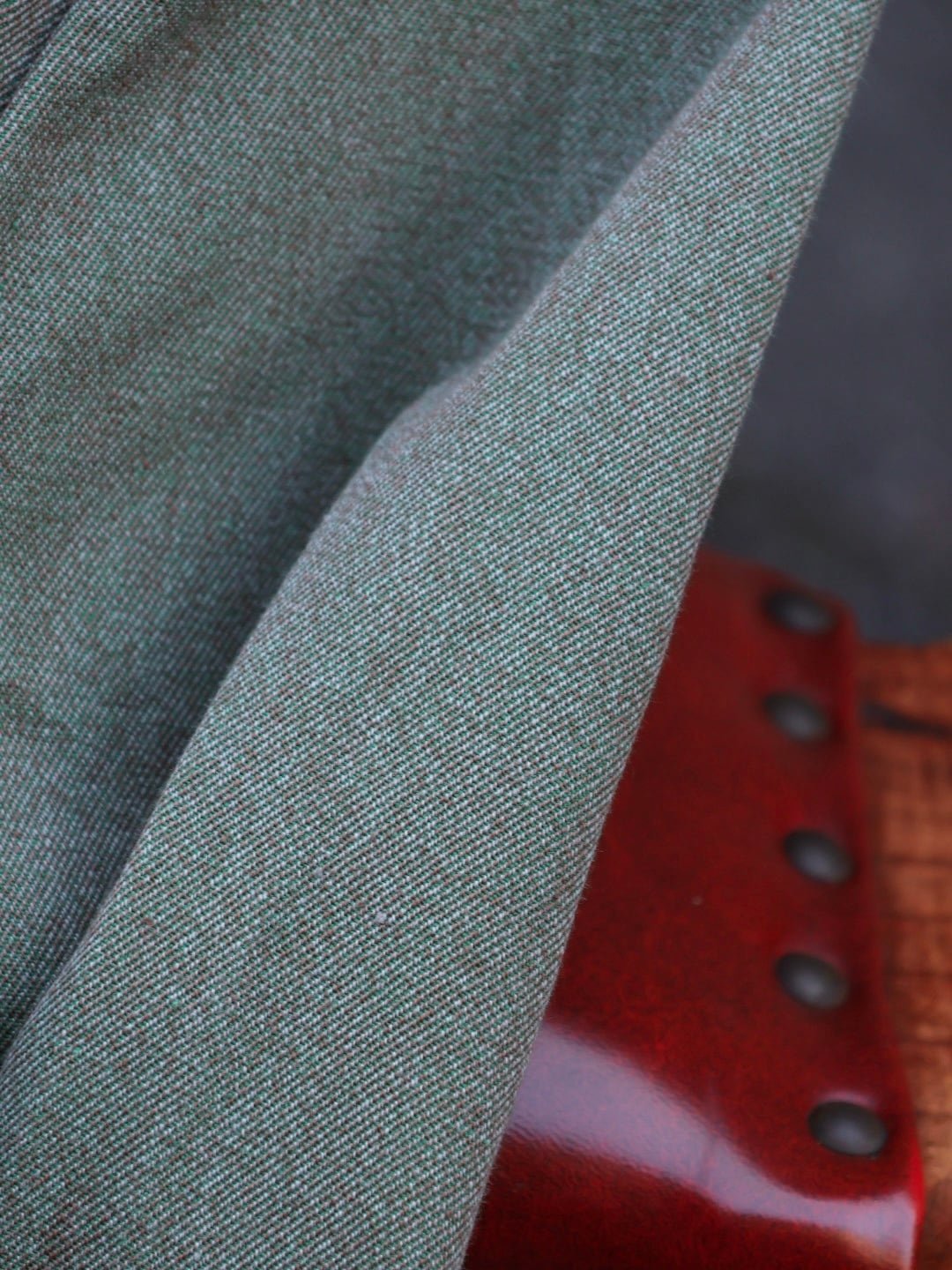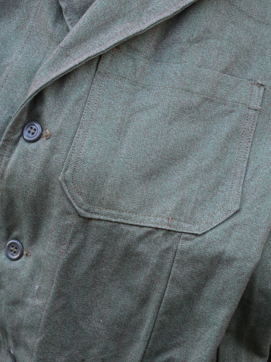 くすんだ緑と、赤茶っぽい糸のコットンツイルで、