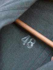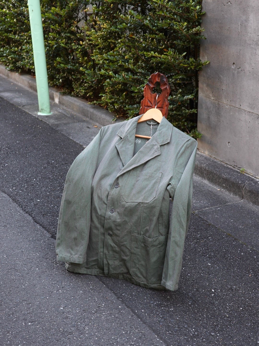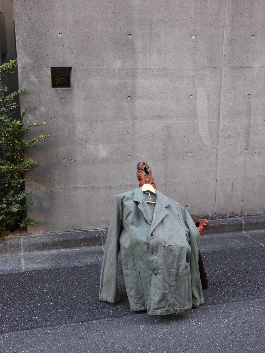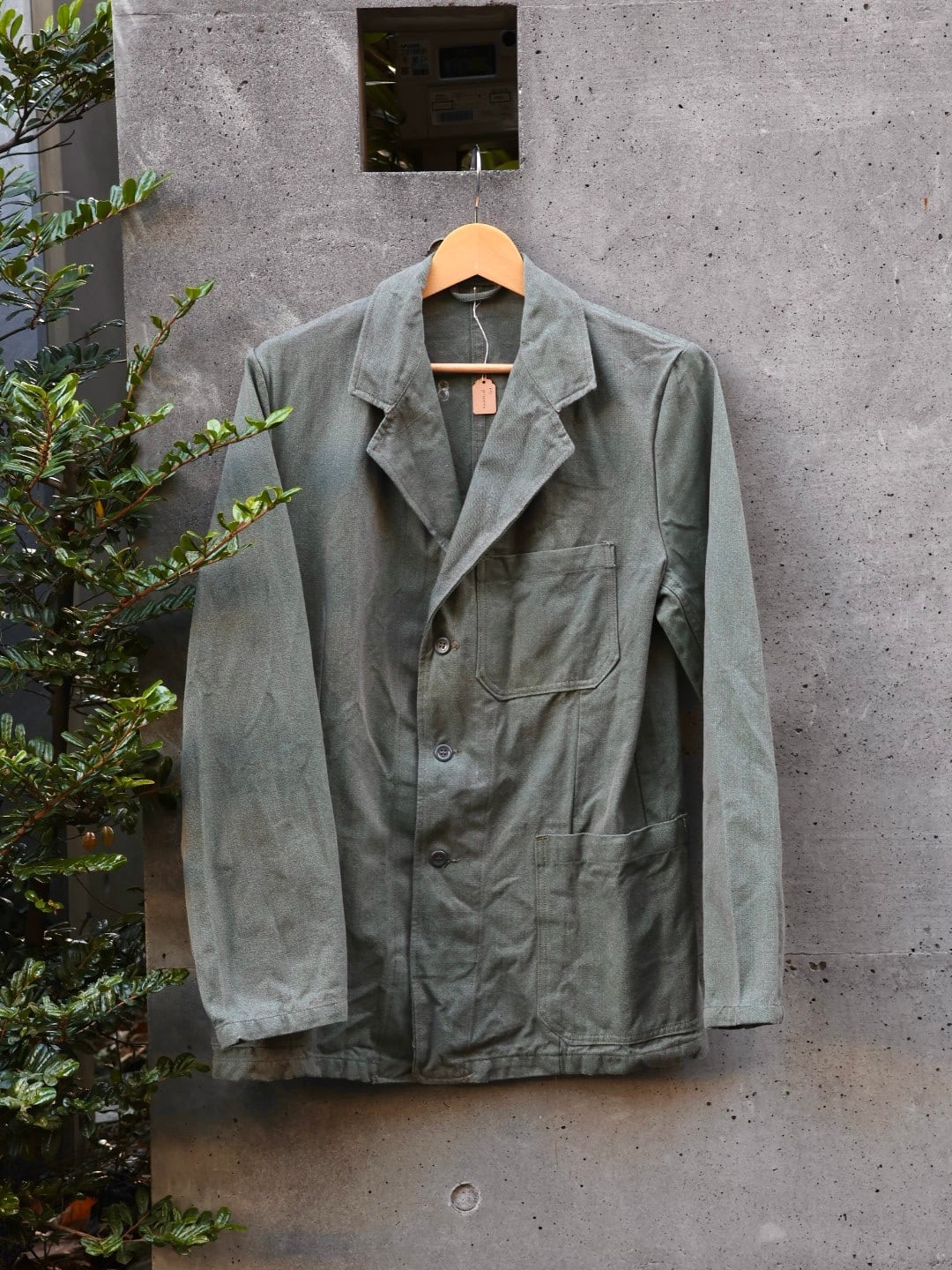 くすんだ緑と、赤茶っぽい糸のコットンツイルで、