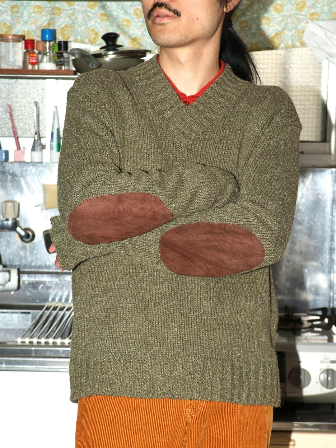 肘にはブラウンのレザーパッチ