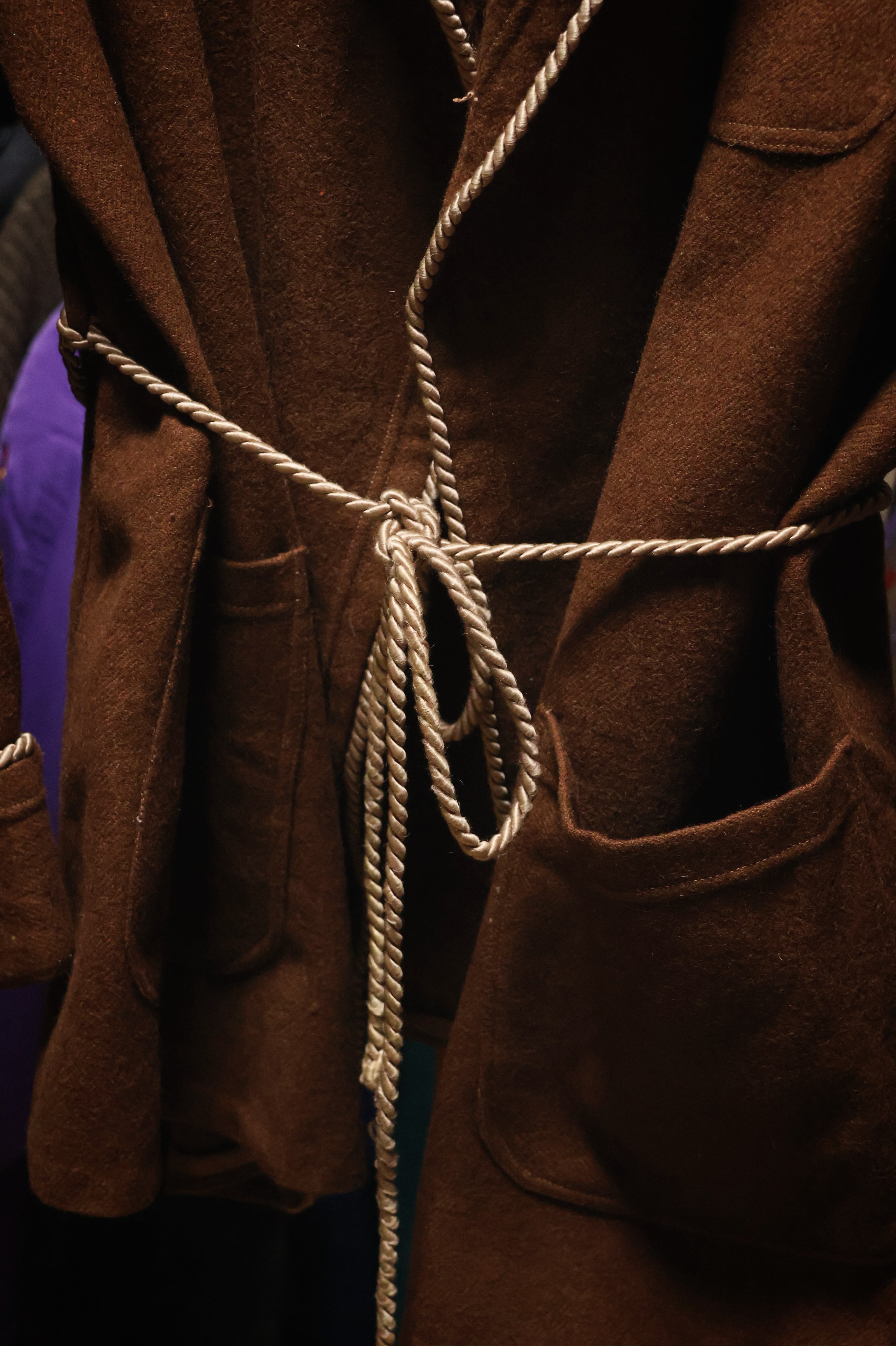渋いブラウンで、襟や袖にはロープのパイピングがあります。