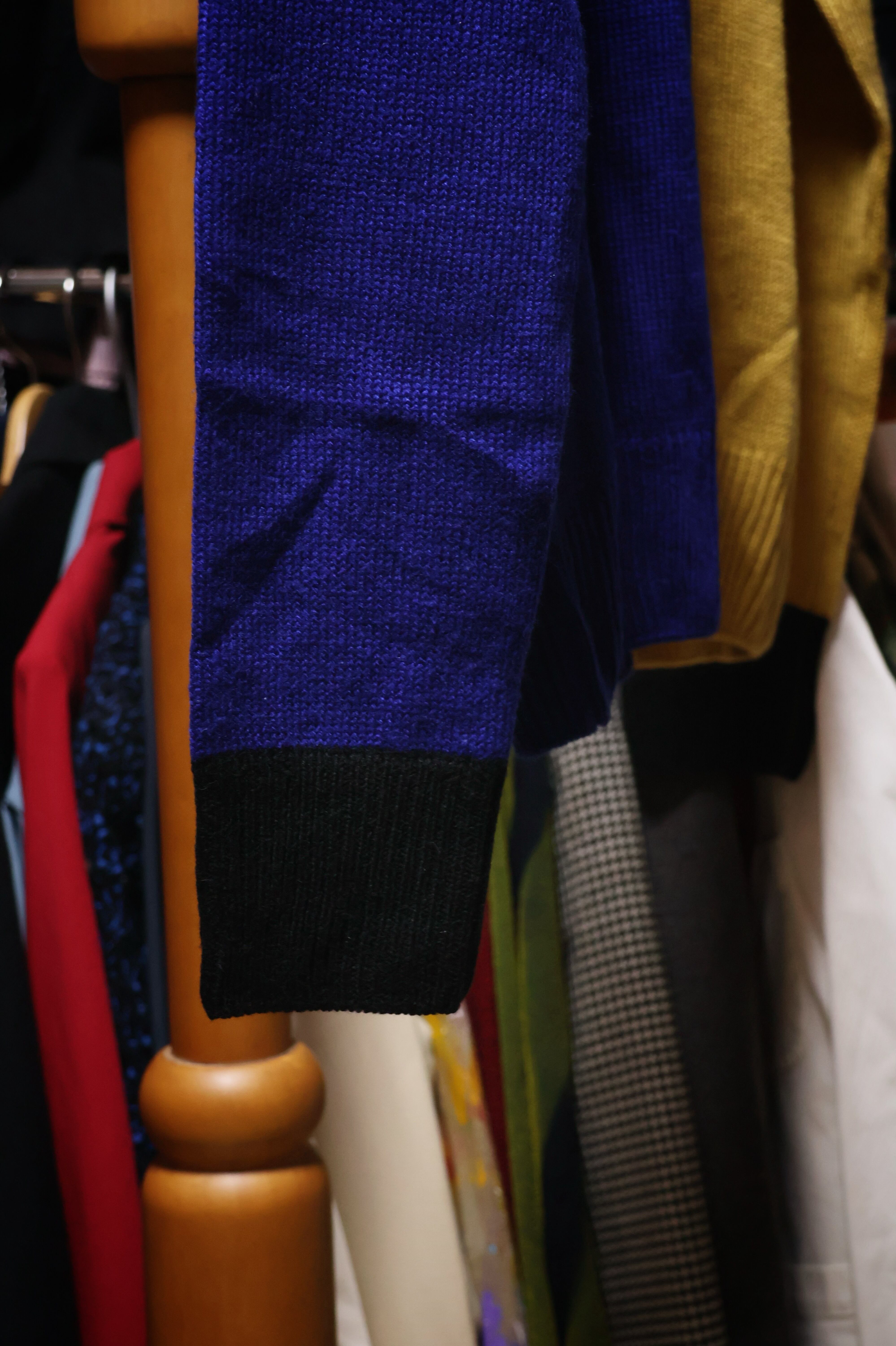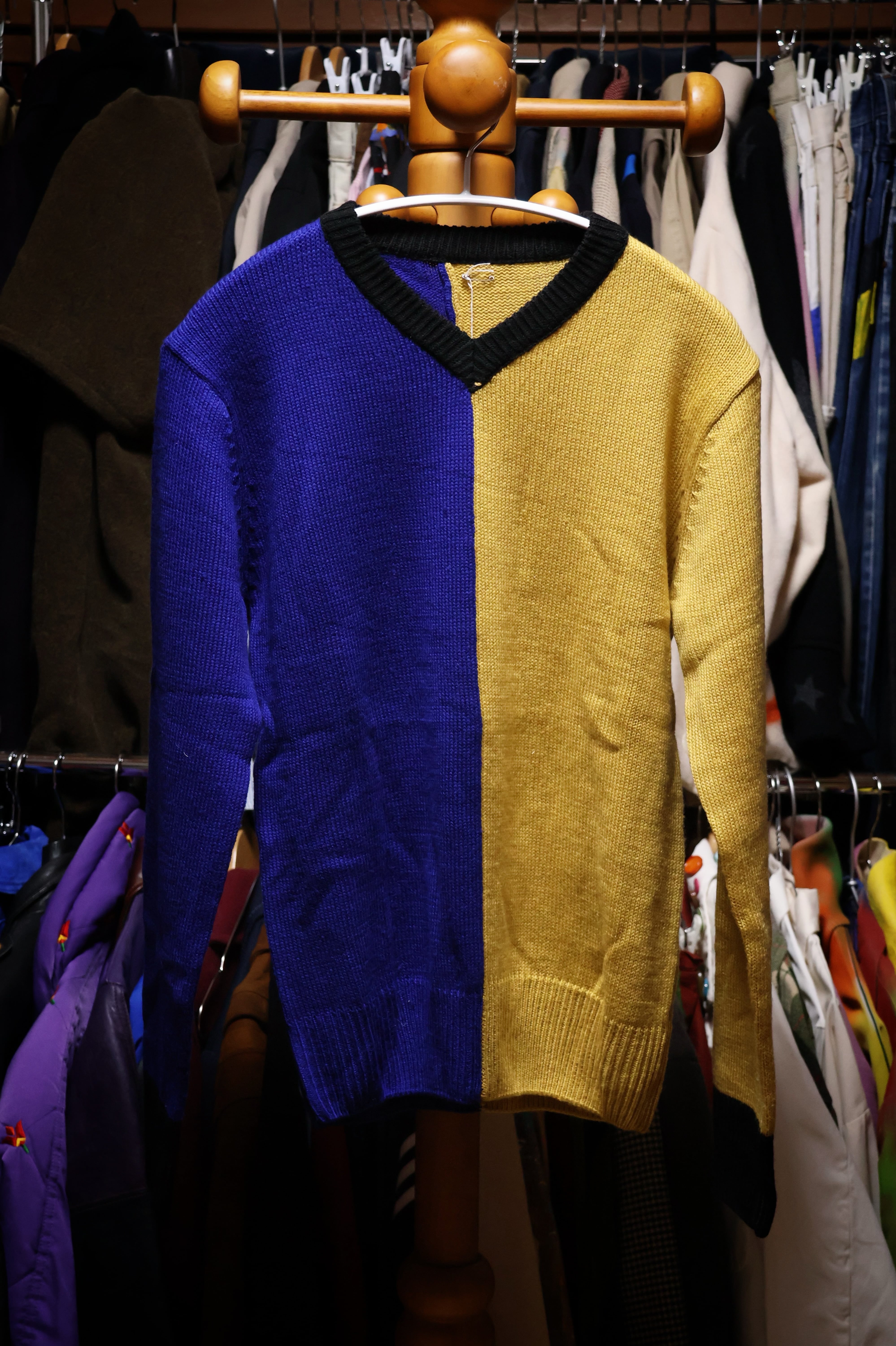 ブルー×イエロー×ブラックのマルチカラーニット。