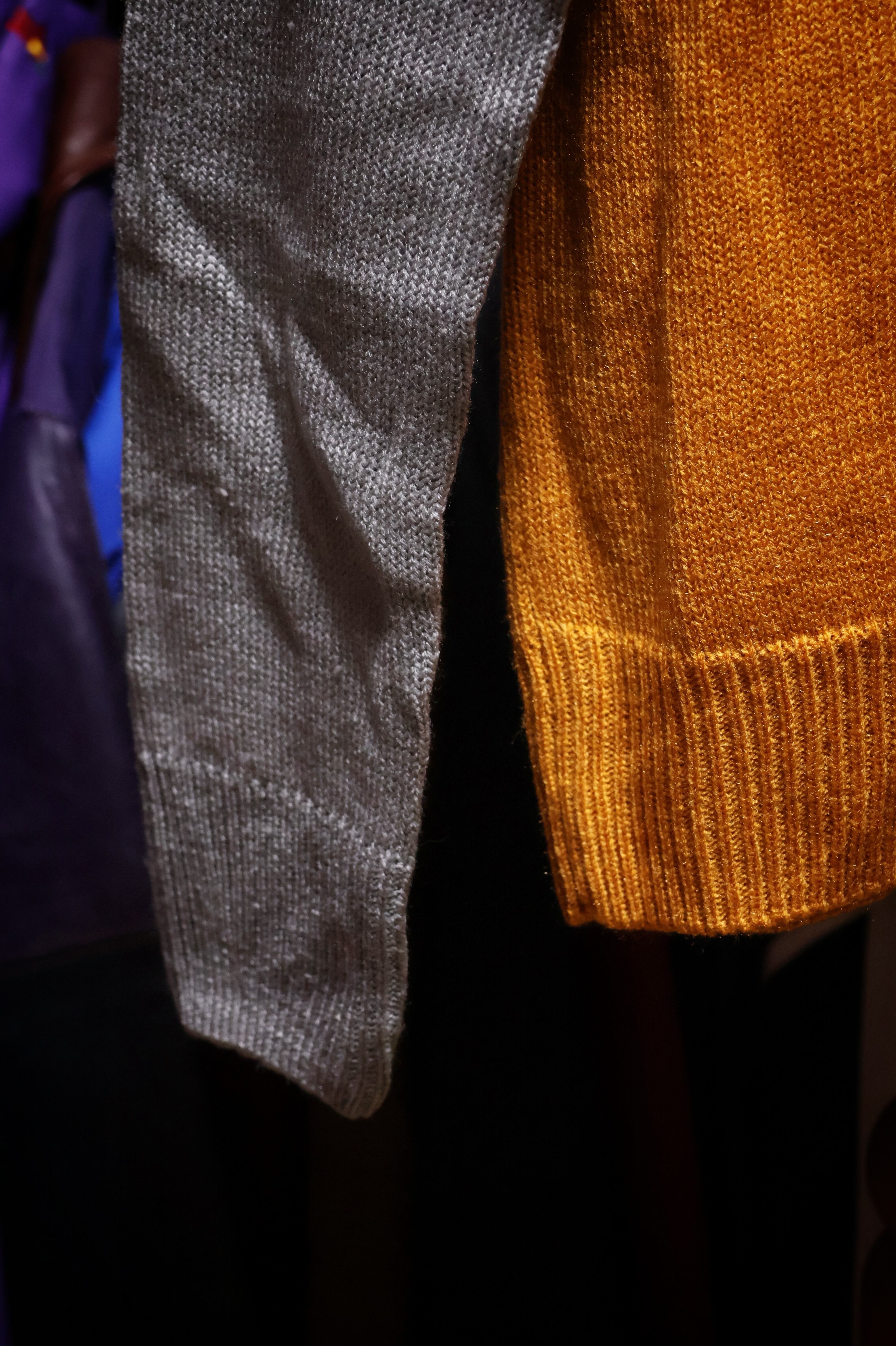イエロー×グリーン×グレー×ブルーのマルチカラーニット。