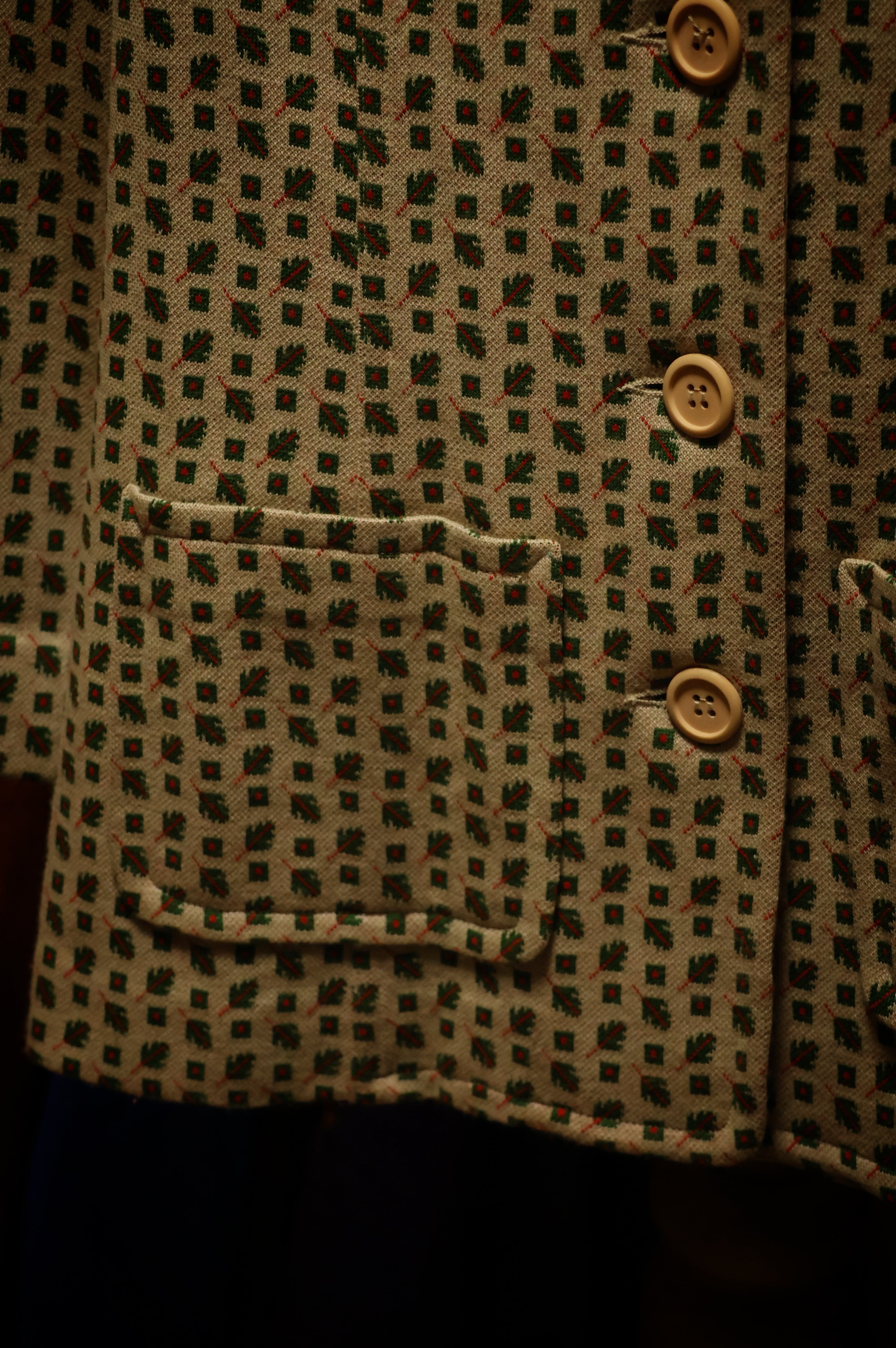 センスアリな総柄です。グリーンとレッドの細かい総柄で、モチーフは葉っぱと、まぁ四角ですかね。