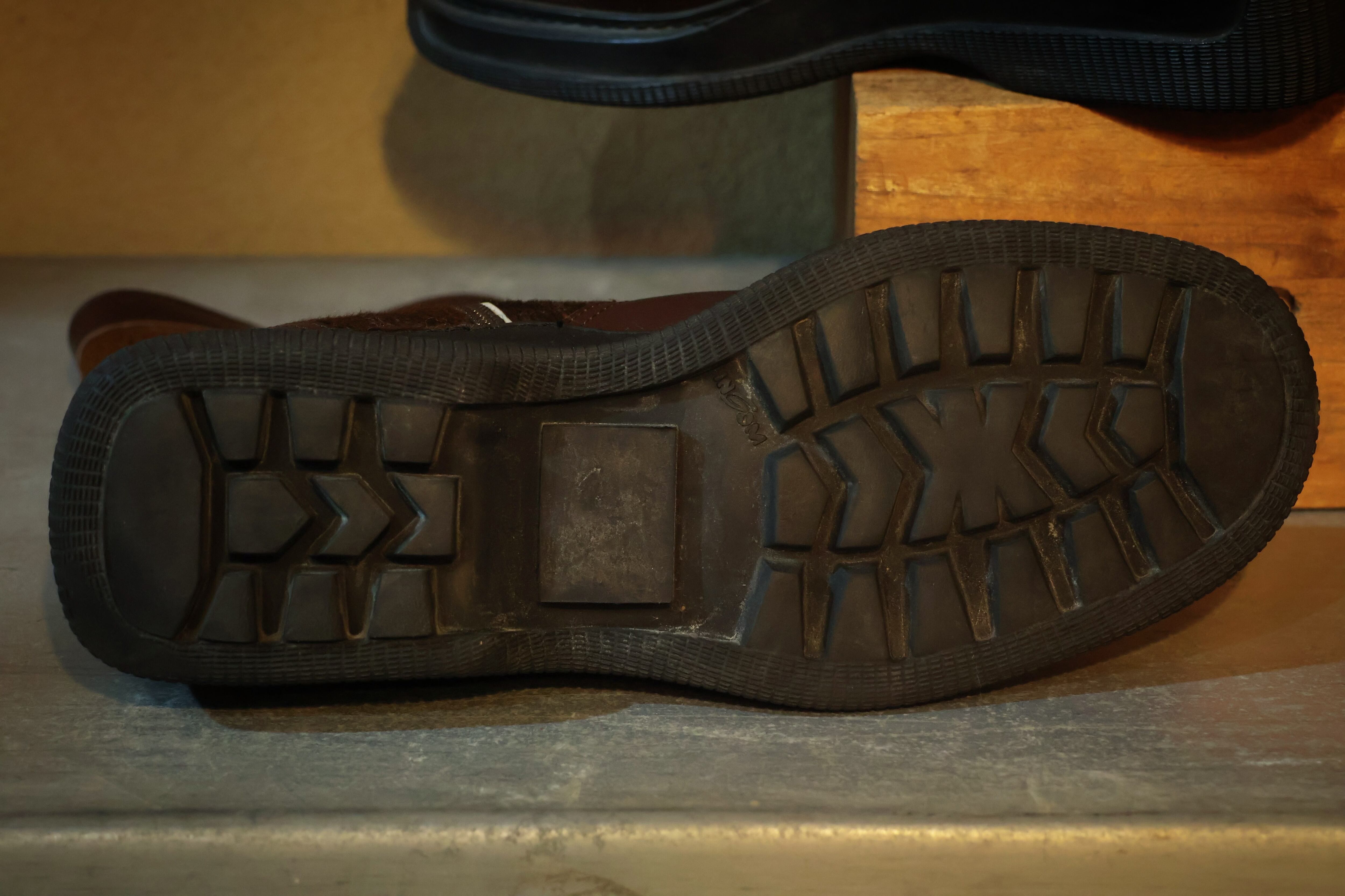 こちらのブーツは全面ではありませんが、筒の部分にブラウンのハラコが、それ以外には濃いブラウンのスムースレザーが用いられています。